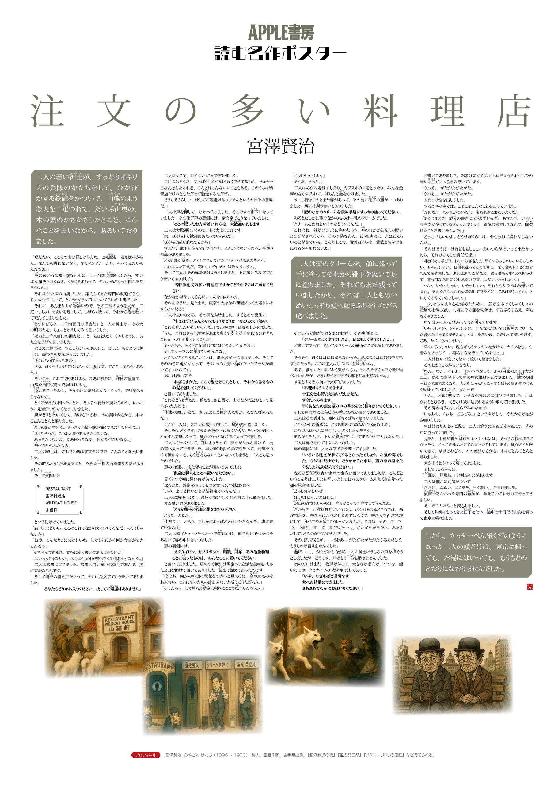 宮沢賢治『注文の多い料理店』(4)イラスト小(4コマ) 2025年8月19日 最終更新日時 : 2025年8月20日 yzshoten@gmail.com 宮沢賢治『注文の多い料理店』(4)イラスト小(4コマ) (kenji04) 定価(税込)¥4,000販売価格(税込)¥4,000在庫状態 : 在庫有り『注文の多い料理店』をA1サイズのポスターに! 物語の流れを4コマにまとめました。 こちらの商品は、ポスターのみの販売になります。市販の各種サイズの額縁にピッタリ収まります。 発色が非常に綺麗なのが特徴のポスターです。アート作品に適した厚手印画紙を使用しており、適度な落ち着いた光沢感があります。 梱包方法:専用ダンボールに梱包して発送していますので、折れなどはありませんのでご安心してお買い求めください。 ポスターサイズ:841㎜×594㎜(A1サイズ) ポスターのみのため、フレームは付属しておりませんので予めご了承お願いします。 数量 FacebookX